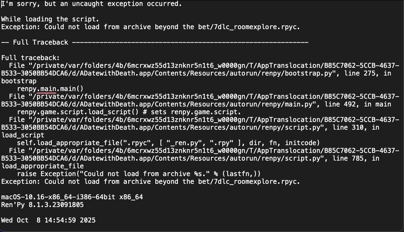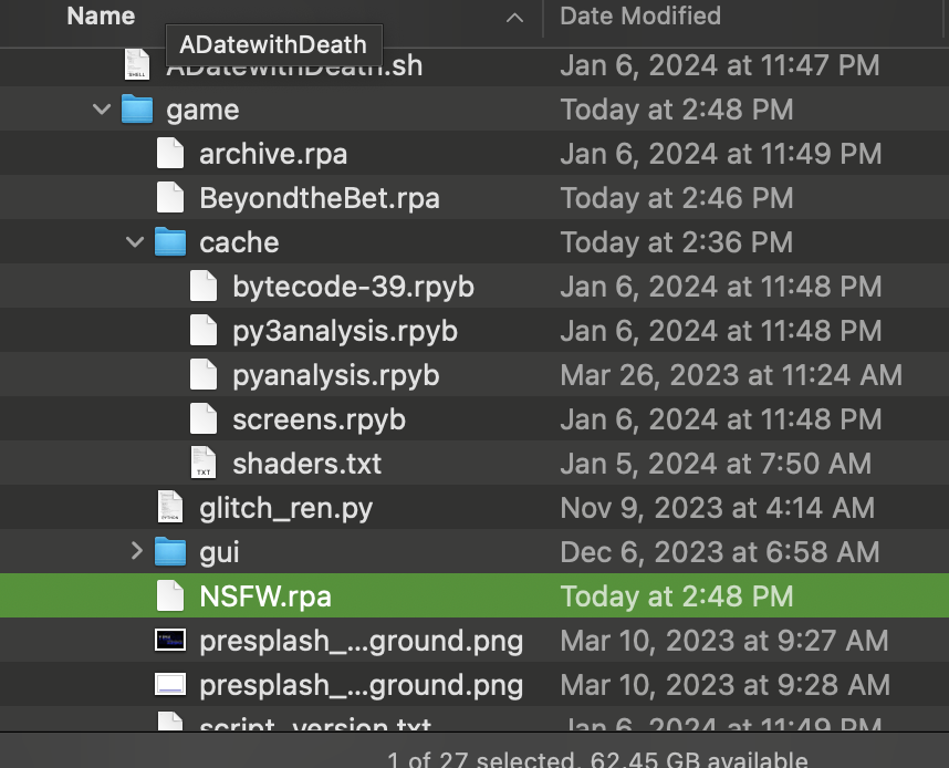 I've been trying to download both the DLC and the Adult patch. Beyond the bet goes into the game files perfectly and is in the right spot, but I try to drag the Adult patch into the same spot, but it keeps going into the GUI files and not the game files. I've tried dragging it around, and it can be put into any other file group aside from the game file. Also, even without the adult patch, I tried to open the game after I downloaded the DLC, but I keep having an error message pop up that the application couldn't run the Beyond the Bet files. The game runs just fine on its own, but it doesn't seem to run the DLC for me. I'm on Mac and I used the website to download both the DLC and the Patch. Can someone help me?