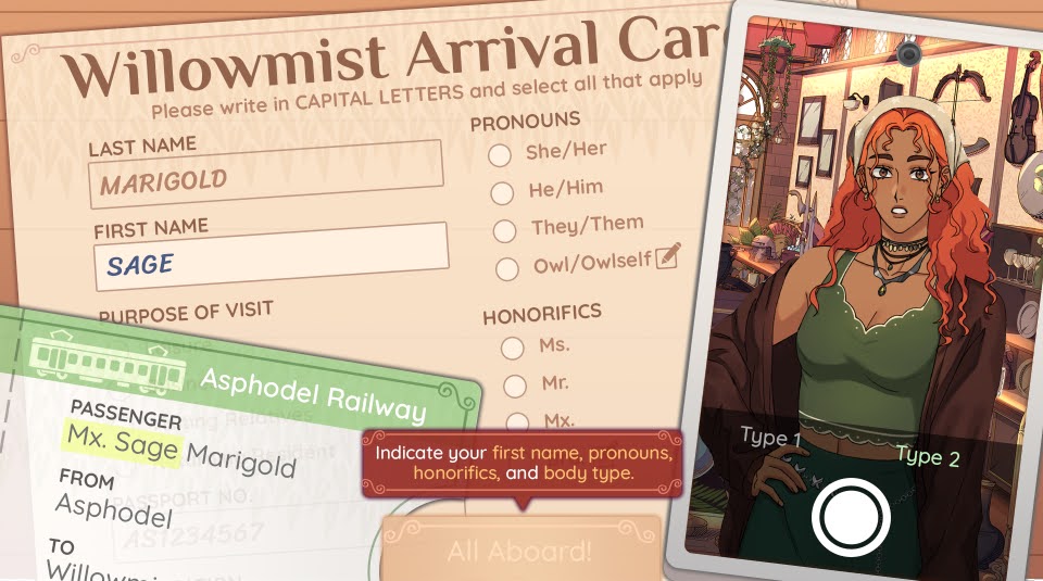 - Create Your Character: Choose between two character bases for Sage (renameable) and select their pronouns.