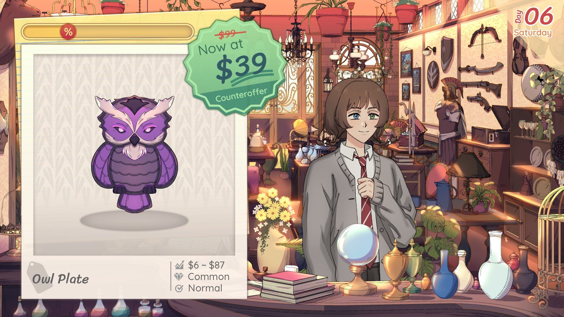 - Buy, Sell, Haggle: Keep the store stocked with unique antiques and decide how to price them. Learn the market, upgrade stock, and try to avoid fakes.