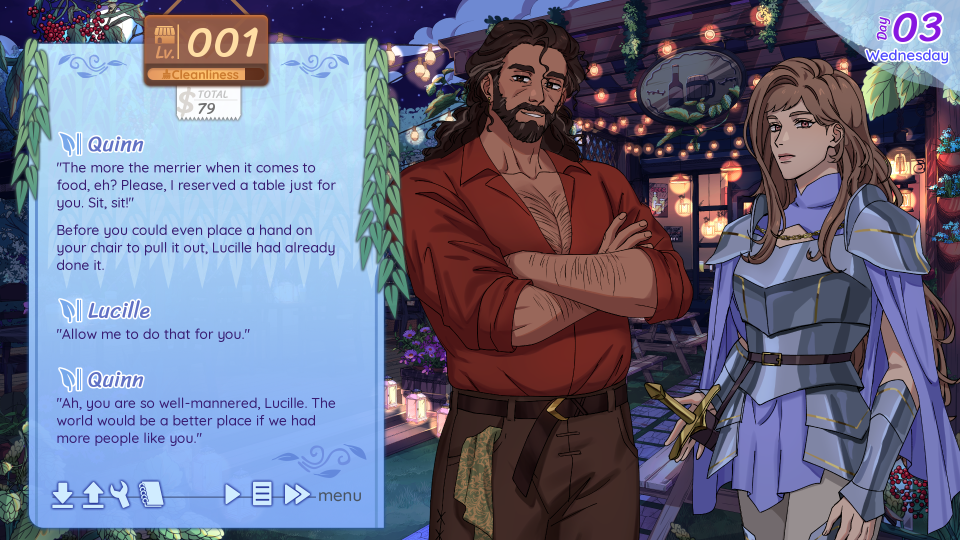 However that also brings me to the primary hurdle this demo seems to be struggling with. Pacing. For there are multiple instances of characters giving fifteen to thirty minutes of lore dumping, without hardly any input from Sage. Like for instance with the knight's first event we get her background and marriage thoughts on the same day. With few proper Sage inserts or choices in-between. This could be fixed by learning the backstory on the first day and only learning about the marriage prospects if we decide to romance her.